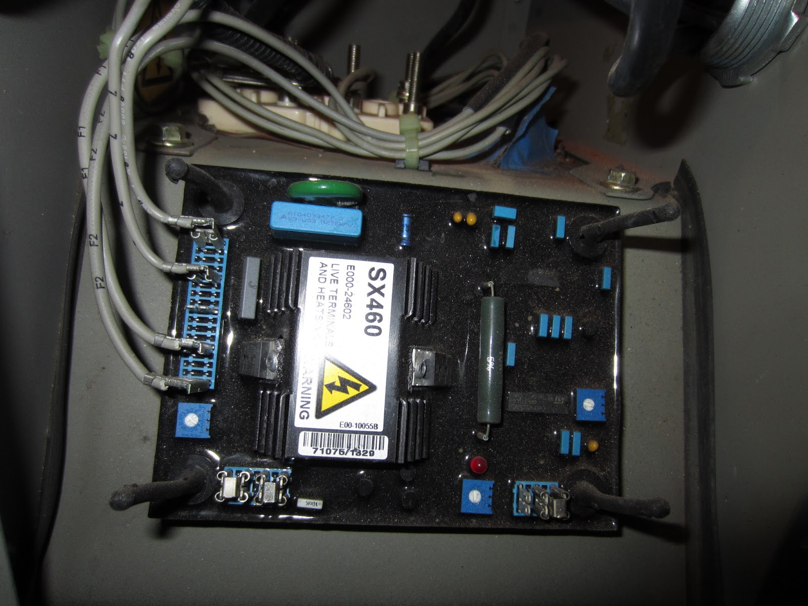 The problem we worked on Sunday was the "voltage regulator". (In the voice of McCoy: "I am a computer programmer not a diesel mechanic!"). The engine is up front and it drives a Stamford generator. The only symtom we had was on the generator control panel was that the frequency (Hz) was at times bouncing all over the place (anywhere from 10 to 80Hz). I talk to Obie @ ESI that can service the Kubota and generator systems. The next question is: Does the generator also bounce around speeding up and down? Answer: no (it just runs happily along). Now, the generator has a small bit of history when it was initially installed. There is a claim that the voltage regulator was found bouncing around in the control box (pictured right). This could have very well shorted out some part of the control mechanism. Obie says we should replace the regulator and he also hands me a fuel filter. So, I leave ESI with a fuel filter and a $600 newish voltage regulator. I say newish as the part inside is new, but there is a small amount of dust surrounding the box (well aged?). Sunday was the day for the swap out. Nice warm weather expected with freezing rain (but rain never materialized; so far!). We open up the generator control box. We have three black cables coming in from the bottom right (max 20 Amps). The voltage regulator is at the bottom.